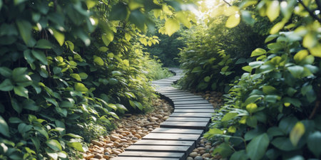 AI Generated. Serene wooden pathway through lush greenery and pebbles in a tranquil garden setting