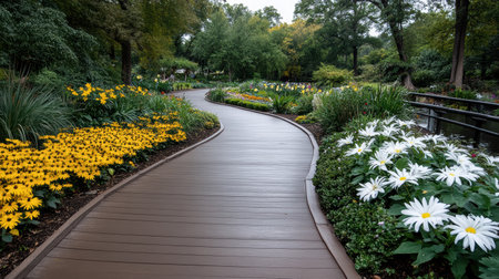 Scenic garden path with colorful flowers blooming on each side, creating a vibrant and peaceful atmosphere