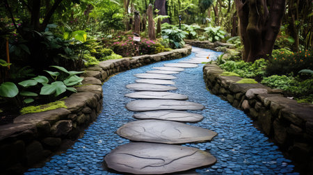 A peaceful garden pathway made of hexagonal stones, flanked by rich green foliage and tropical plants, creates a serene outdoor atmosphere.