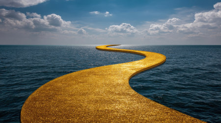 A mesmerizing golden pathway stretches across the ocean, creating a dreamlike scene blended with vibrant colors and soft clouds that invite exploration.
