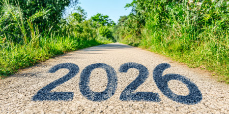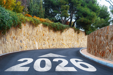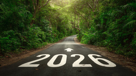 Curved road ahead with clear indication of the year 2026 surrounded by lush greenery