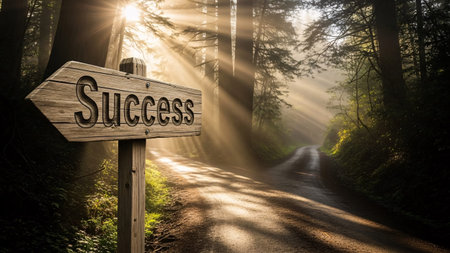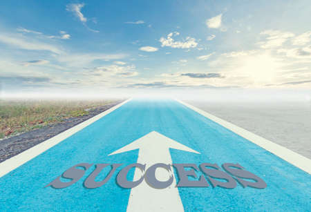 Success word written on the road with arrow on nature background with sunlight. Business planning concept and new year beginning success idea