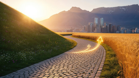 A digital illustration depicts a cobblestone path winding through a landscape of fields and hills, guided by a glowing upward arrow, leading toward a distant city and mountains. The scene is bathed in warm sunlight, with golden hues emphasizing the wheat field. This image is suitable for various commercial uses, including advertising and editorial content.