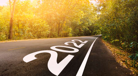 The new year 2022 or straightforward concept. Text 2022 written on the road in the middle of asphalt road at sunset. planning and challenge, business strategy, opportunity, hope, and new life.