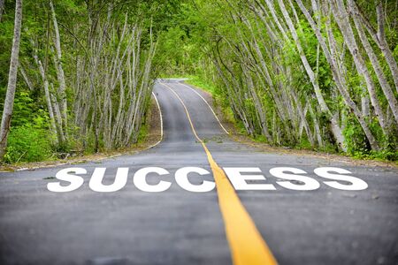 Tree tunnel with success word on asphalt road surface, business success concept and natural idea