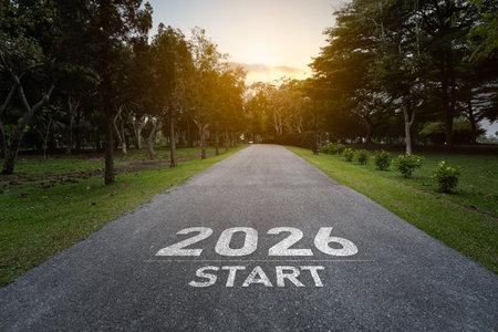 Happy new year, 2026 symbolizes the start of the new year. The letter start new year 2026 on the road in the nature route roadway have tree environment ecology or greenery wallpaper concept.
