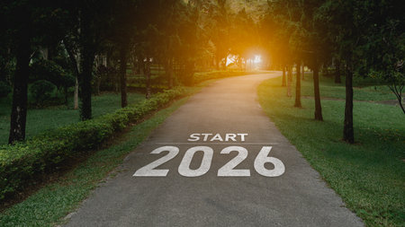 Happy new year 2026, Inspirational Pathway Imagery with Start Mark and Future Year 2026 in Serene Park Setting Surrounded by Lush Green Trees and Soft Sunrise Light