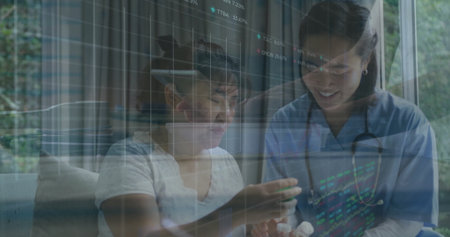 Image of data processing over biracial female nurse talking with patient. global medicine and digital interface concept digitally generated image.