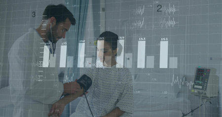 Crouching nurse checking blood pressure on senior patient in hospital bed, digital graph overlay. Healthcare, medical, hospital, diagnostics, professionalism, patientcare, clinical