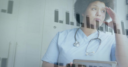 Holding tablet nurse analyzing data at nurse station, stethoscope and bar chart overlay, copy space. Healthcare, technology, analytics, professional, data visualization, clinical, modern