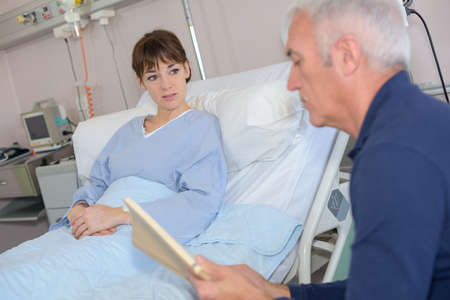 Young recovering woman lying in bed and talking to experienced oncologist in lab coat sitting in front of her and giving medical advice