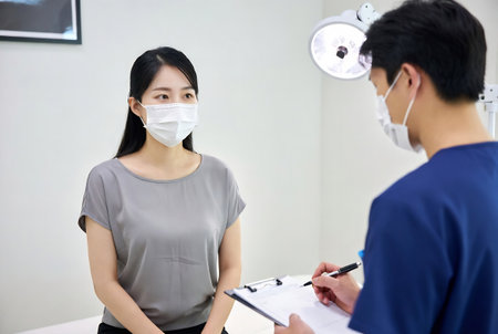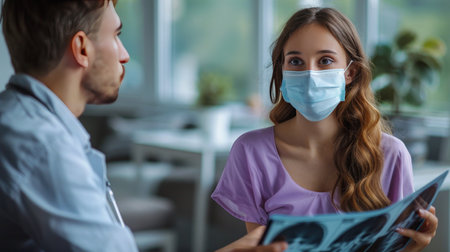 Woman wearing a protective mask while having a medical consultation with a doctor in a clinical setting