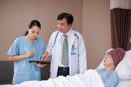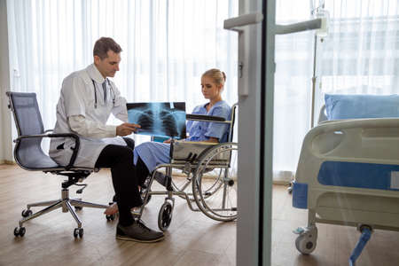 Caucasian female doctor in uniform diagnosis explains x-ray film with Asian radiologist and recovery male patient at inpatient room bed in a hospital ward, medical clinic, cancer examination consult.