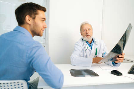 Close-up of mature adult male physician consult scared young man patient giving bad news explaining results of MRI image. Unhappy frustrated young man listening to bad news sitting in doctor office.