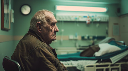 An elderly man sits in a hospital room, reflecting his emotions of solitude and depression. The scene highlights vulnerability within a healthcare environment.