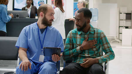 Multiethnic group of people doing consultation in hospital reception, having medical appointment with specialist in waiting area. Patient and nurse talking and using digital tablet.