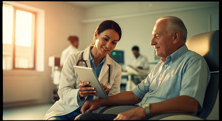 A female doctor in a white coat shows a tablet to a seated elderly man in a light blue shirt in a well-lit clinic setting.