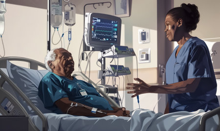 nurse providing care and conversation to elderly senior patient in hospital room, surrounded by medical equipment, compassion and support during recovery. High quality photo