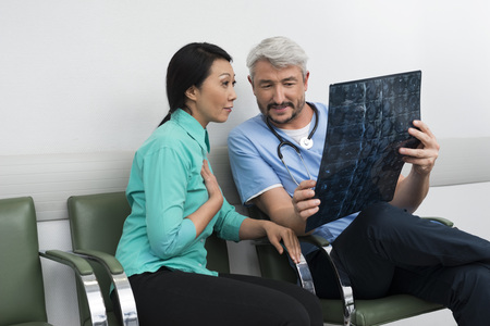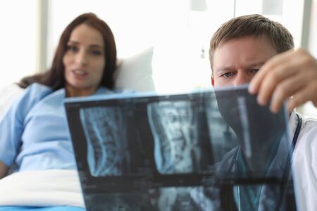 Doctor looking at x-ray next to patient in clinic. Patient remains under medical supervision. Selection and correction course treatment. Disorders musculoskeletal system. Spinal disease therapy