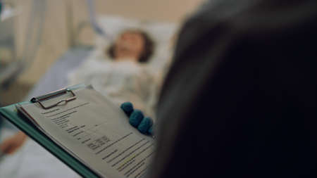 Closeup medical clipboard in doctor hands. Therapist checking patient history. Unknown physician making notes in treatment scheme in hospital ward. Healthcare worker on daily checkup in clinic room.