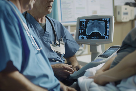 In a busy operating room, a doctor and a nurse are intently examining a device, which is being utilized for important medical purposes. Generative AI