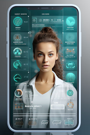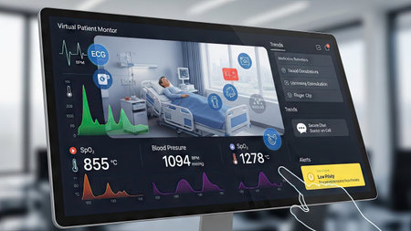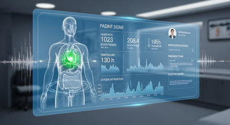 A digital screen showcases a patient monitoring system displaying vital signs and patient data. The screen includes graphical representations of heart rate, blood pressure, and other physiological metrics. The style is modern, with vibrant colors against a dark background, suggesting a medical or technological context suitable for editorial and commercial applications.