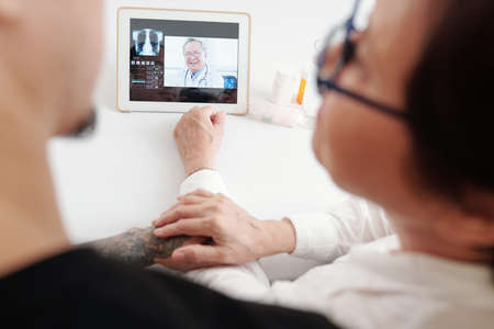 Senior woman and her adult son sitting at table with digital tablet and getting telemedicine session with physician