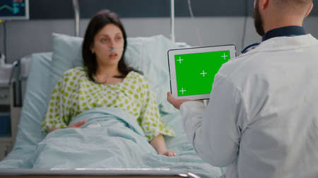 Physician practitioner man discussing with woman patient resting in bed about disease treatment. Doctor holding mock up green screen chroma key tablet computer with isolated display in hospital ward