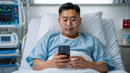 A patient in a hospital bed is using a smartphone while wearing an oxygen nasal cannula. The setting is bright and clinical, indicating a modern healthcare environment