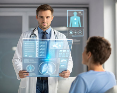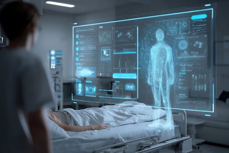 Advanced medical technology display shows patient's health data with holographic representation of the body.