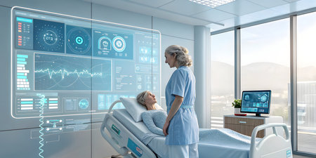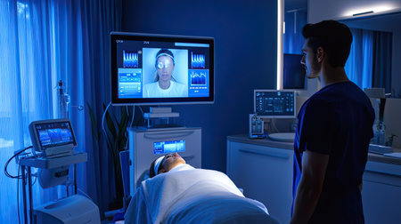 A medical professional observes a patient during an advanced health assessment in a modern hospital room, showcasing state-of-the-art equipment and technology.