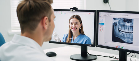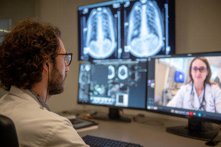 Radiologist engages in a virtual consultation with a patient, analyzing CT images displayed on dual screens in a contemporary medical setting. High-definition resolution captures the details clearly.