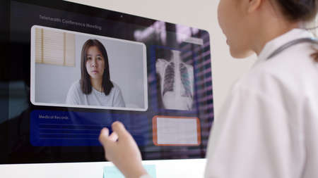 Attractive beautiful asia chinese female doctor video conference call online live talk follow up remotely in medical coronavirus result with patient at office. Online telehealth telemedicine service.