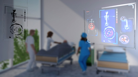 Medical equipment, hospital, medical examination, anatomical scan, future medicine, 3d skeleton. Medical office. Interactive screen. Specialist. 3d rendering