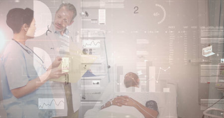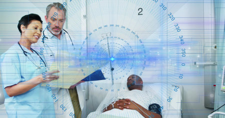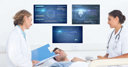 Lying male patient being flanked by nurse and doctor in hospital room with digital HUD overlay. Medical, healthcare, technology, diagnostics, clinical, patient care, innovation
