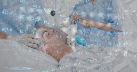 Monitoring doctor beside patient using oxygen mask in hospital with data overlay, copy space. Medical, healthcare, diagnostics, clinical, emergency, monitoring, technology