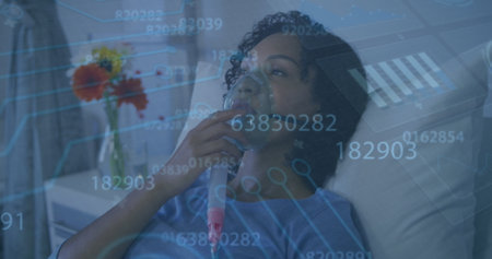 Image of data processing over african american woman using oxygen mask. Global covid 19 pandemic, medicine and healthcare services concept digitally generated image.