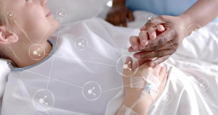Comforting nurse in blue scrubs holding girl's hand in hospital room, with IV line network overlay. Healthcare, patient, caregiver, medical, technology, assistance, wellness