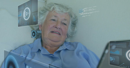 Reclining senior woman gazing at laptop in living room, with floating digital interface panels. Retirement, wellness, innovation, modern, technology, comfort, senior