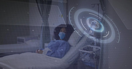 Lying patient wearing gown and mask viewing holographic data in hospital ward, IV stand, copy space. Healthcare, medical technology, diagnostics, hospital environment, patient care, digital health