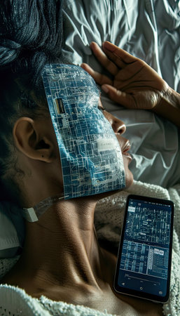 Lying male patient wearing printed gown in hospital bed, with digital circuit overlay, copy space. Medical, technology, healthcare, digital, futurism, diagnostics, wellness