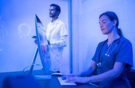 Two doctors wearing lab coats examining X-ray film in radiology room, with digital data overlays. Medical, collaboration, technology, diagnostics, analysis, healthcare, innovation