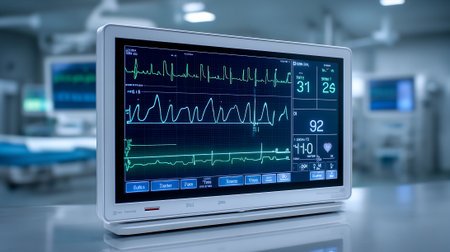 Modern Medical Monitor Presenting Patient Vital Signs and Dynamic Waveforms in Clinical Space.