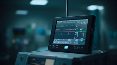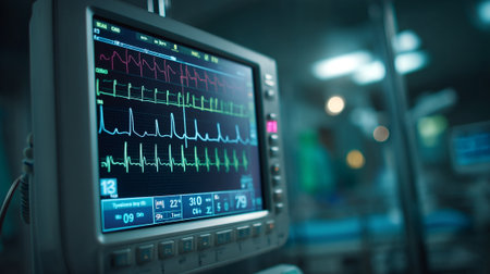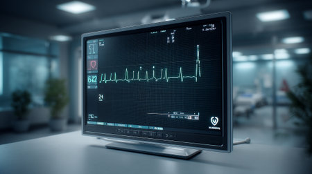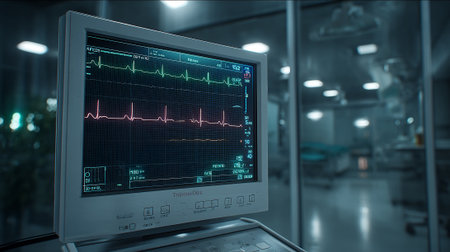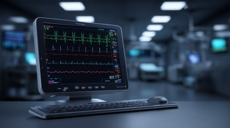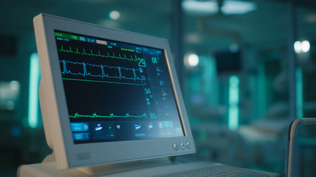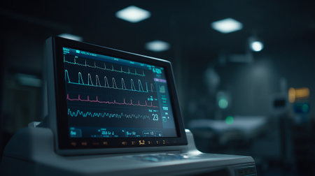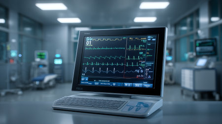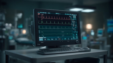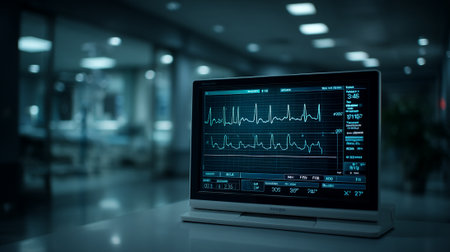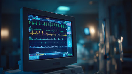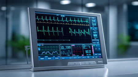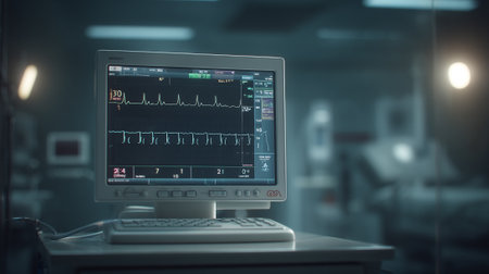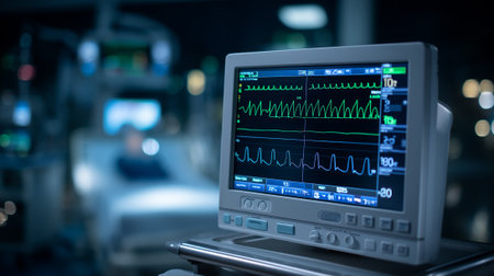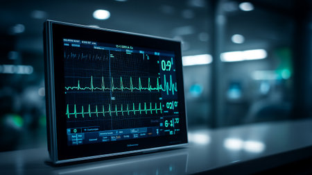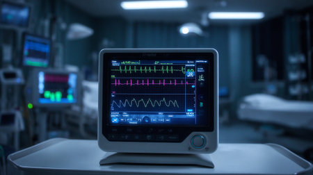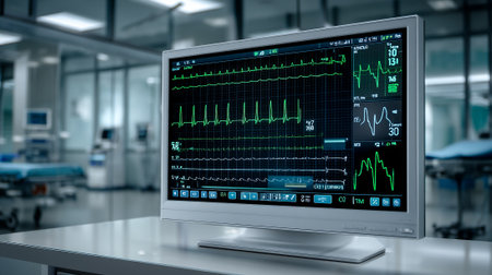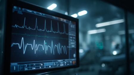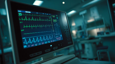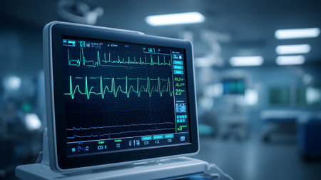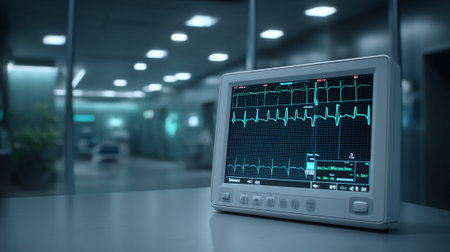 Advanced Medical Monitor Displaying Real-Time Heart Rhythm Data in a Sophisticated Clinical Diagnostic Setting.