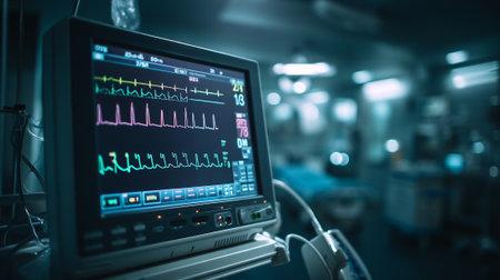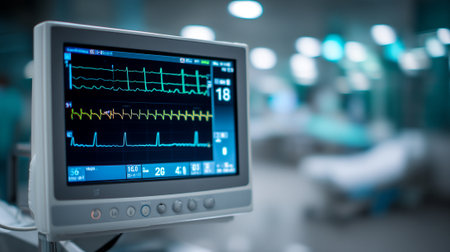 Advanced Medical Monitor Displaying Patient Vital Signs in Hospital Environment, Healthcare Technology for Critical Care Monitoring.