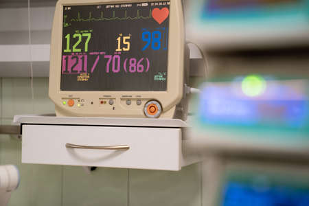 Heart rate monitor in hospital theater. Medical vital signs monitor instrument in a hospital on anesthesia surgery monitor. ECG Patient Monitor. medical electronics.