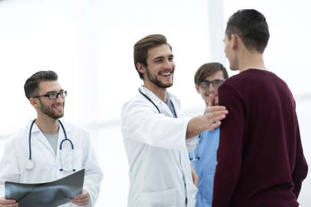 Young doctor in the clinic shaking the hand with his older patient