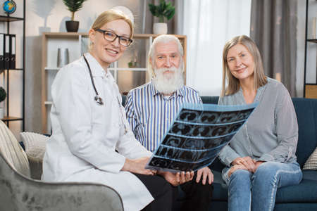 Doctors home visit. Pleasant positive friendly woman doctor explaining the results of x-ray CT scan of senior bearded man, sitting with his smiling wife on sofa, posing at camera.