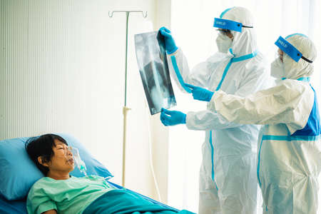 Asian doctor in personal protective equipment or ppe looking at x-ray film of covid-19 or coronavirus infection patient in the hospital. coronavirus, covid-19 outbreak, or medical hospital concept