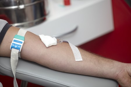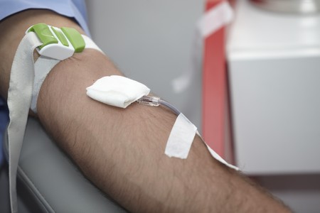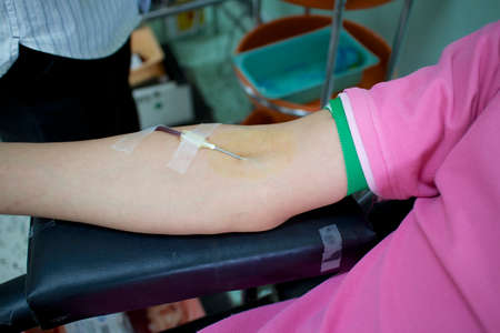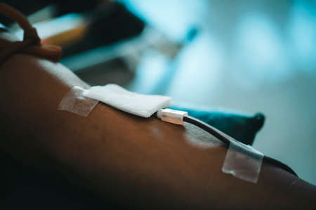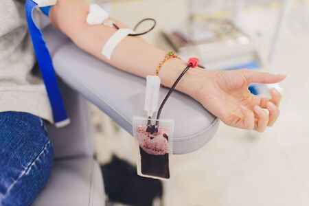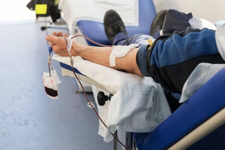 Donating blood in hospital, close-up. Blood donor at donation station.